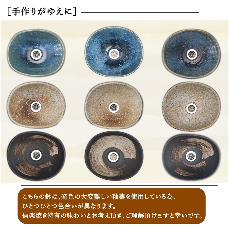 • ●信楽焼は土物ですので陶磁器の洗面ボウルに比べると多少は汚れやすいです。